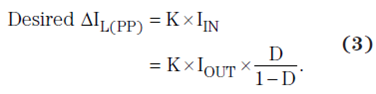設計任何 PWM 開關調節器的首要步驟之一便是決定允許多少電感紋波電流 ΔIL(PP)。過多會增加 EMI,而過少又會導致不穩定的 PWM 運行。一般原則是給 K 分配一個介于 0.2 和 0.4 平均輸入電流之間的值。理想紋波電流的計算如下: