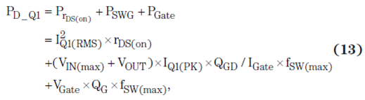 在相關環境溫度下,FET 功耗額定值必須大于傳導損耗(FET rDS(on) 的函數)和開關損耗(FET 柵極電荷的函數)的和,計算方法如方程式 13 所示: