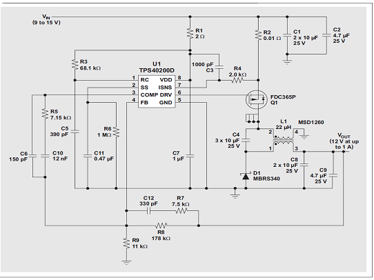 就本例而言,諸多要求都是針對一個 η= 0.9 峰值效率的 12-V、1-W 電源。負載為穩態,因此幾乎看不到負載瞬態。2-A 輸入電源為 9 到 15V。我們選擇了異步電壓模式控制器即 TI TPS40200,其工作在 340 和 460kHz 之間的開關頻率下。輸入端和快速電容器的最大允許紋波分別為彼此交叉最大電壓的 1%。最大輸出紋波為 25 mV,而最大環境溫度為 55ºC。由于 EMI 并不是問題,通過使用最小輸入電壓,我們選擇了具有更低電感值的電感。下一頁的表 1 概括了前面介紹的一些設計計算方法。我們忽略了方程式 7 到 9 以及方程式 11,因為使用了高 RMS 電流額定值的低 ESR 陶瓷電容。