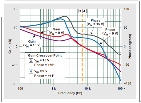 圖 7 VIN=9V 和 15V 且 IOUT=1A 時的環路響應