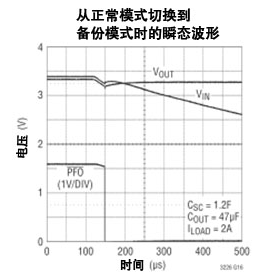 圖 3:LTC3226 從正常模式切換到備份模式時的瞬態波形