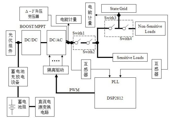 正常工作時,開關Switch1、Switch2、Switch3、Switch4 同時閉合,為當?shù)刎摵商峁╇娔埽划旊娋W(wǎng)缺相、電壓嚴重跌落等非正常狀況時,由DSP 檢測出異常情況,做出判斷決策,并控制開關的開通與關斷。這時,開通Switch1 和Switch2,關斷Switch3,保證重要負荷的供電。當逆變器發(fā)生故障時,立即斷開Switch1,逆變器退出,同時斷開Switch4,由電網(wǎng) 對重要負荷供電。當逆變器故障消失時,再與電網(wǎng)同步后,開通Switch1,在閉合Switch4。恢復對當?shù)刎摵傻墓╇姟.斝枰獧z修逆變器時,先斷開開 關Switch2,檢修完成后,重新閉合Switch2。