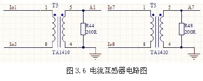 此系統(tǒng)輸出電流小于1A,故選擇最大可以測量1A 的電壓型電流互感器TA1410,負載電阻用是200歐,輸出電壓為-1~1V 的交流電壓。電路如圖3.6 所示。