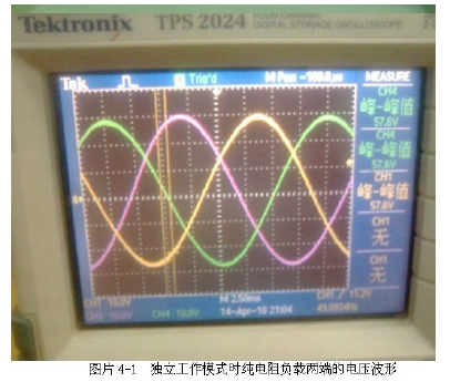 光伏并網(wǎng)發(fā)電系統(tǒng)要實現(xiàn)并網(wǎng),必須使逆變輸出與電網(wǎng)電壓的幅度、相位與頻率達到一致,否則將會使電網(wǎng)諧波增加、電能質(zhì)量下降,并產(chǎn)生并網(wǎng)環(huán)流,甚至造成光 伏發(fā)電系統(tǒng)的損壞。因此在并網(wǎng)過程中必須進行同步鎖相控制、輸出電壓幅度控制以滿足并網(wǎng)的要求。根據(jù)IEEE Std 1547-2003 規(guī)定最大相位誤差為20 度,瞬時電壓誤差不能超過電網(wǎng)電壓的10%、最大頻率誤差不能超過0.3Hz。圖片4-1為獨立工作模式時純電阻負載兩端的電壓波形。