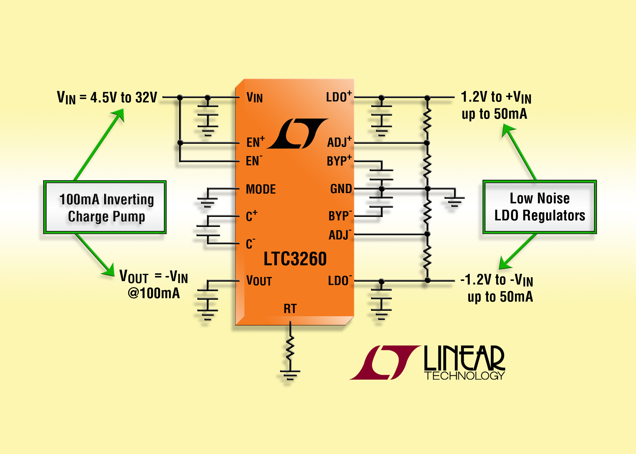 加利福尼亞州米爾皮塔斯 (MILPITAS, CA) – 2012 年 5 月 10 日 – 凌力爾特公司 (Linear Technology Corporation) 推出通用高壓充電泵 LTC3260 和 LTC3261。LTC3261 是高壓負(fù)輸出充電泵,可提供高達(dá) 100mA 的輸出電流。LTC3260 具有與 LTC3261 相同的充電泵,但還包括兩個正及負(fù) LDO 穩(wěn)壓器,每個 LDO 穩(wěn)壓器可提供高達(dá) 50mA 的輸出電流。負(fù) LDO 后置穩(wěn)壓器由負(fù)輸出充電泵的輸出供電。正和負(fù) LDO 輸出電壓可用外部電阻器分壓器分別調(diào)節(jié)至 1.2V 和 -1.2V。兩款器件均在 4.5V 至 32V 的寬輸入電壓范圍內(nèi)工作。