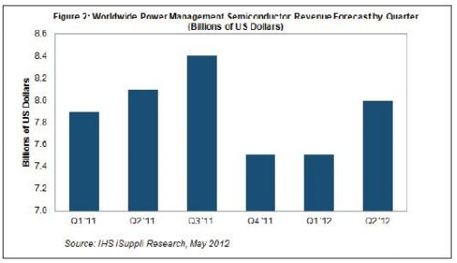 據IHS iSuppli公司的電源管理市場追蹤報告,繼2011年第四季度慘跌之后,電源管理半導體在2012年初有所回升,并在第二季度終于走上明顯增長之路,主要是受消費與工業領域的擴張推動。