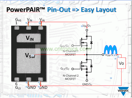 這種器件的另一個好處是布線。從圖2中可以看到,封裝的引腳使其能很容易地集成進降壓轉(zhuǎn)換器設(shè)計方案中。更特殊之處在于,器件的輸入是在一側(cè),輸出在另一側(cè)。引腳2和3與DC-DC電路的VIN相對應(yīng),是高邊MOSFET的漏極。小焊盤也是高邊元器件的漏極焊盤。較大的焊盤是電路的開關(guān)節(jié)點的焊盤更大,在這個地方,高邊MOSFET的源極合低邊MOSFET的漏極在內(nèi)部連到器件上。這個節(jié)點會連到電感器。最后,接地是引腳4和5,是低邊MOSFET的源極。引腳1和6 分別連到高邊和低邊MOSFET的柵極。這種布線很簡單,而且減少了用兩個器件時發(fā)生布線錯誤的幾率。把多個器件組合在一起時需要額外的PCB走線,這種布線還能減少與此種PCB走線相關(guān)的寄生電感: