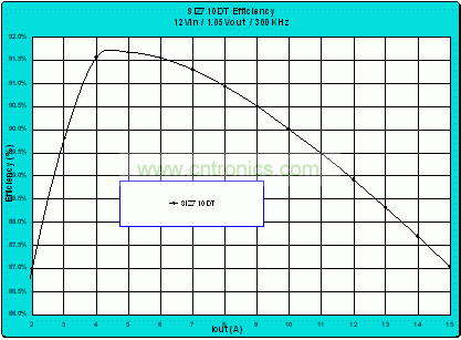 改用較小外形尺寸雙芯片功率封裝的最后一個好處是能夠?qū)崿F(xiàn)的效率可以幫助提高功率密度。器件安裝在單相降壓轉(zhuǎn)換器評估板上,條件如下。
