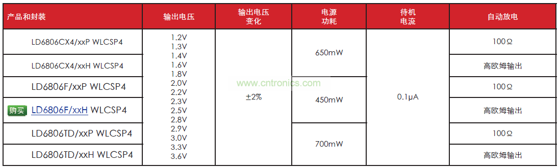 除了 0.76 毫米 x 0.76 毫米的 WLCSP4 封裝選項之外,LD6806 系列還可采用 1.0毫米 x 1.45 毫米 XSON6 以及 1.5 毫米 x2.9 毫米 SOT753 封裝。兩個變型均以各個封裝樣式提供,使設計人員能夠選擇適用于非放電應用的高歐姆輸出,或選擇自動放電變型,它配備有在設備處于禁用狀態時提供低歐姆輸出的下拉式開關晶體管。