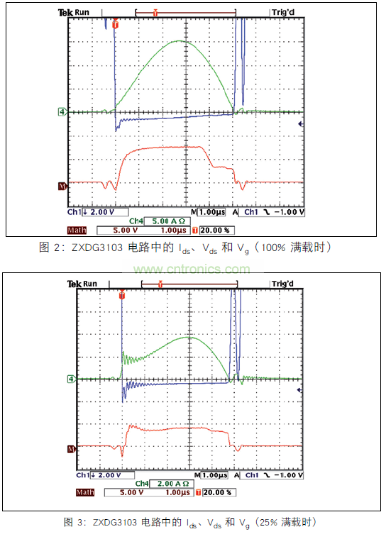 在滿載測試電路中,柵極驅動電壓在正弦電流開始減少時早期終止,這可能是由電路的電感和 Q1 TO-220 封裝的電感造成的。 與前面使用 ZXGD3103 的測試一樣,對布局進行改進、減少阻抗和選擇低電感的封裝應該可以解決此問題。