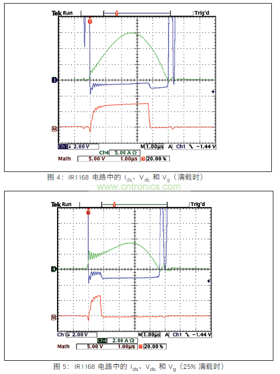 同上面一樣,圖 4 顯示了測試電路滿載 (F.L.) 下的波形詳圖,圖 5 顯示了 25% 滿載下的波形詳圖 (使用 IR1168 設備)。 同 ZXGD3103 一樣,IR1168 測試電路揭示了快速柵極驅動電壓;在探測到寄生二極管在 MOSFET 中的正向壓降之后約 200 納秒內,Q1 打開,減少其電壓 (Ch1 - Vds)。同前面一樣,Q1 Vds 高于預期,可能是出于同樣的原因。