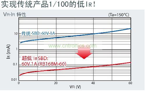 此次,羅姆通過采用最適合高溫環境的金屬,實現了業界頂級低IR化。與傳統的SBD相比,IR降低到約1/100,使高溫環境下的使用成為可能。