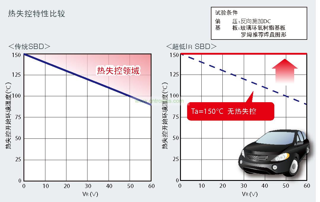 高溫環境下使用的車載、電源設備的電路中,由于擔心熱失控,因此普遍采用整流二極管和快速恢復二極管(FRD)。但是由于整流二極管和FRD的VF值較高,因此很難實現EV和HEV所要求的更低功耗。在這種背景下,VF值較低的肖特基勢壘二極管(SBD)在高溫環境下亦可安全使用的產品的開發需求逐年高漲。