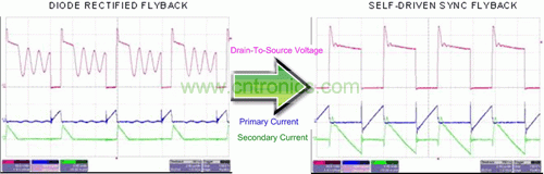 在自驅動同步反向電源中,輸出二極管被一個 N 通道 MOSFET 代替,同時必須向電源變壓器添加一個繞組以生成同步柵極驅動信號。相比輸出二極管整流器,該同步MOSFET的低導通電阻可帶來更低的傳導損耗,這就極大地提高了高負載電流時的效率。