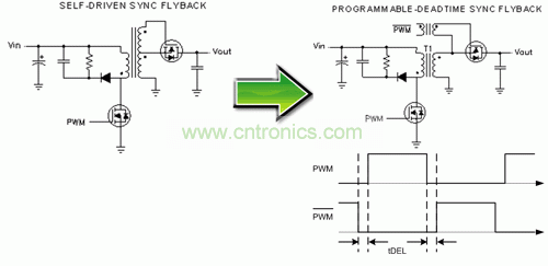 圖 3 顯示了一個具有可編程延遲的隔離柵極驅動信號如何被添加到同步反向結構中以消除直通損耗。通過柵極驅動變壓器,可以實現隔離和電平變換。必須使用擁有較好驅動輸出和可調節延遲的 PWM 控制器(例如:UCC2897),以便對一次側和二次側同步 MOSFET 進行控制。延遲必須足夠長,以確保同步 MOSFET 能夠在一次側 MOSFET 開啟以前被完全關閉。然而,延遲太長會引起一個或兩個 MOSFET 上出現主體二極管傳導,并導致過多的功率損耗。由于最佳停滯時間取決于一次側和二次側 MOSFET 延遲時間、轉換速度、電源變壓器漏電感以及柵極驅動電路,因此可調節延遲時間控制器對最小化損耗至關重要。