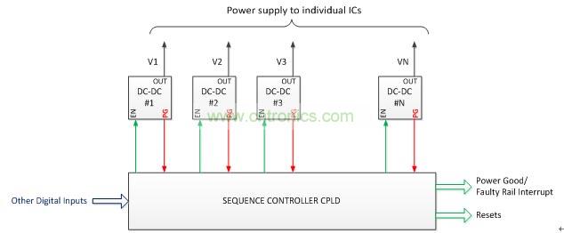 一個(gè)實(shí)現(xiàn)復(fù)雜的電源管理的常用方法(圖2)是使用DC-DC轉(zhuǎn)換器的電源良好信號(hào),以監(jiān)測這個(gè)電源,并使用CPLD來實(shí)現(xiàn)定序算法(控制DC-DC轉(zhuǎn)換器的使能信號(hào))。CPLD也產(chǎn)生監(jiān)測信號(hào),如電源就緒/故障電壓中斷和復(fù)位信號(hào)。