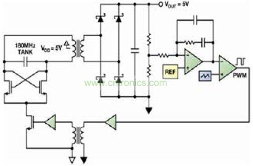 的其他數據通道信號相同。當為能量轉換和反饋設置不同的控制路徑時,可以優化能量轉換效率,同時維持調節的穩定性。圖2(b)展示的是帶四個獨立的隔離數據通道的500 mW隔離dc-dc轉換器。
