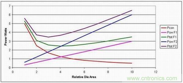 但是,在更高的工作頻率下,最佳裸片面積較小,從而帶來成本節約。實際上,在低頻率下,通過調整裸片面積來最小化損耗會帶來極高成本的設計。但是,轉到更高工作頻率后,我們就可以優化裸片面積來降低損耗,從而縮小電源的半導體體積。這樣做的缺點是,如果我們不改進半導體技術,那么電源效率將會降低。
