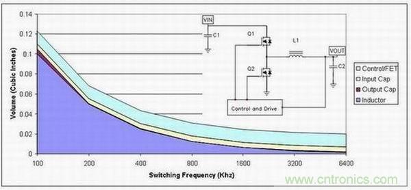圖1顯示的是降壓電源頻率與體積的關系。頻率為100 kHz時,電感占據了電源體積的大部分(深藍色區域)。如果我們假設電感體積與其能量相關,那么其體積縮小將與頻率成正比例關系。由于某種頻率下電感的磁芯損耗會極大增高并限制尺寸的進一步縮小,因此在此情況下上述假設就不容樂觀了。如果該設計使用陶瓷電容,那么輸出電容體積(褐色區域)便會隨頻率縮小,即所需電容降低。另一方面,之所以通常會選用輸入電容,是因為其具有紋波電流額定值。該額定值不會隨頻率而明顯變化,因此其體積(黃色區域)往往可以保持恒定。另外,電源的半導體部分不會隨頻率而變化。這樣,由于低頻開關,無源器件會占據電源體積的大部分。當我們轉到高工作頻率時,半導體(即半導體體積,淡藍色區域)開始占據較大的空間比例。