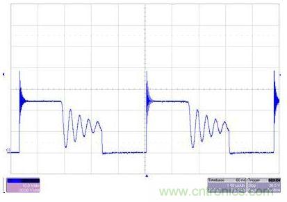 圖2 SEPIC極大地降低了EMI和電壓應力。上圖沒有C1,而下圖則安裝了C1。