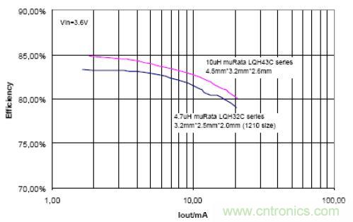 圖 10 顯示整個鋰離子電池電壓范圍(2.7V~4.2V)內均可以實現 80% 以上的效率。在此應用中,使用了一個高度僅為 1.2mm 的電感 (Sumida CMD4D11-4R7, 3.5mm*5.3mm*1.2mm)。 從圖 10 中的效率曲線可以看出:在大多數應用中,升壓轉換器可以實現比充電泵解決方案更高的效率。但是,在無線應用中使用升壓轉換器或充電泵時還需要考慮 EMI 問題。