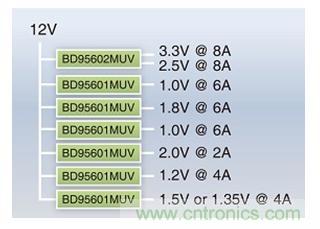 最近的高端FPGA(此次AVNET Internix公司的開發(fā)套件為Xilinx Kintex-7用),由于其制程工藝的微細化以及與其相應的低電壓化、內(nèi)核部與接口部的電源分離以及數(shù)字電路與模擬電路的混裝等多電源化,必然需要先進的電源管理。電壓精度當然要求低波紋,而且要求具備投入時序管理和優(yōu)異的負載瞬態(tài)響應性能。圖3為ROHM電源模塊的輸出結(jié)構(gòu),表示生成上述項目的各開關(guān)穩(wěn)壓控制器與電壓/電流。