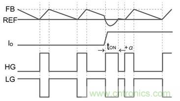 …………(公式)●tON后HG一旦關(guān)斷,低邊MOSFET的柵極(LG)導通,F(xiàn)B引腳電壓開始下降,當與REF電壓達到一致時關(guān)斷LG。
