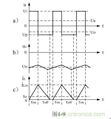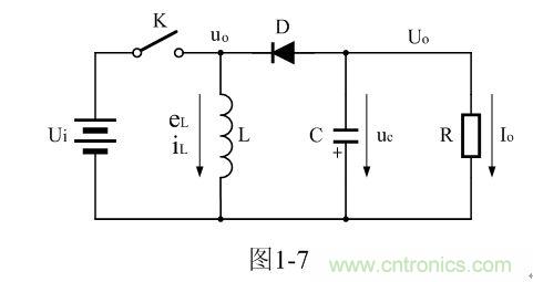 圖1-7中,Ui為輸入電源,K為控制開關,L為儲能電感,D為整流二極管,C為儲能濾波電容,R為負載電阻。當控制開關K接通的時候,輸入電源Ui開始對儲能電感L加電,流過儲能電感L的電流開始增加,同時電流在儲能電感中也要產生磁場;當控制開關K由接通轉為關斷的時候,儲能電感會產生反電動勢,使電流繼續流動,并通過整流二極管D進行整流,再經電容儲能濾波,然后向負載R提供電流輸出。控制開關K不斷地反復接通和關斷過程,在負載R上就可以得到一個負極性的電壓輸出。