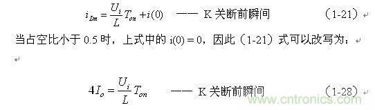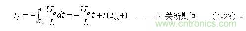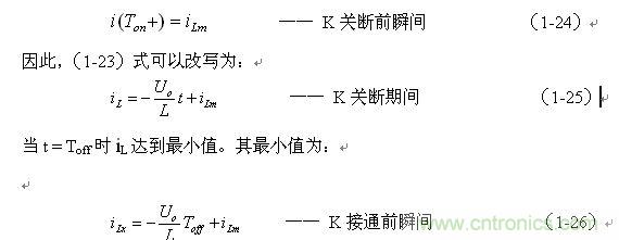 上式中i(Ton+)為控制開關K從Ton轉換到Toff的瞬間流過電感的電流,i(Ton+)也可以寫為i(Toff-),即:控制開關K關斷或接通瞬間,之前和之后流過電感L的電流相等。實際上(1-23)式中的i(Ton+)就是(1-21)式中的iLm,即: