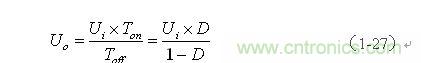 由(1-27)式可以看出,反轉式串聯開關電源輸出電壓與輸入電壓與開關接通的時間成正比,與開關關斷的時間成反比,而與儲能電感L的大小無關;與儲能電感L有關的是輸出電流的大小,電流的大小隱含在(1-21)、(1-25)、(1-26)式中。