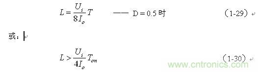 (1-29)和(1-30)式,就是計算反轉式串聯開關電源中儲能電感的公式。同理,(1-29)和(1-30)式的計算結果,只給出了計算反轉式串聯開關電源儲能電感L的中間值,或平均值,由于輸出電流的不確定性,實際應用時,可以以此為極限,在此平均值的計算結果上再乘以一個大于1的系數。