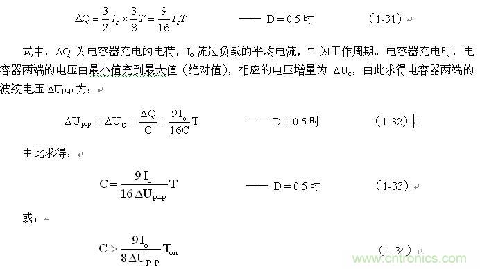 (1-33)和(1-34)式,就是計算反轉式串聯開關電源儲能濾波電容的公式(D = 0.5時)。式中:Io是流過負載電流的平均值,T為開關工作周期,ΔUP-P為濾波輸出電壓的波紋。一般波紋電壓都是取峰-峰值,因此,當D = 0.5時,波紋電壓正好等于電容器充電的電壓增量,即:ΔUP-P = ΔUc 。