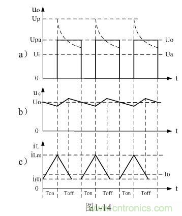 在圖1-12-a中,當控制開關K接通時,輸入電源Ui開始對儲能電感L加電,流過儲能電感L的電流iL開始增加,同時電流在儲能電感L中也要產生反電動勢eL;當控制開關K由接通轉為關斷的時候,在儲能電感L兩端就會產生反電動勢eL。eL反電動勢的方向與開關K關斷前的方向相反,但與電流的方向相同,因此,在控制開關K兩端的輸出電壓uo等于輸入電壓Ui與反電動勢eL之和。