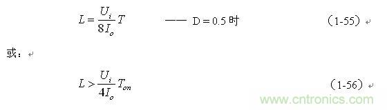(1-55)和(1-56)式,就是計算并聯式開關電源儲能電感的公式。同理,(1-55)和(1-56)式的計算結果,只給出了計算并聯式開關電源儲能電感L的中間值,或平均值,對于極端情況可以在平均值的計算結果上再乘以一個大于1的系數。