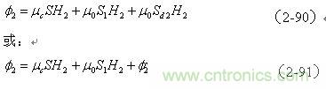(2-91)式中,咋看起來,變壓器初級線圈N1產生的磁通量 全部穿過變壓器次級線圈N2,它們之間應該不存在漏磁通;但是,初級線圈在面積S1中產生的磁通 的方向與在面積Sd2中產生的磁通 的方向,正好互相相反;因此,變壓器初級線圈N1在面積Sd2中產生的磁通 ,仍然稱為變壓器初級線圈N1對變壓器次級線圈N2的漏磁通,其等效電感同樣稱為漏感。
