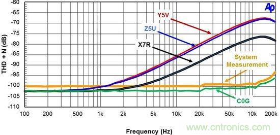 此外,電容器的電介質(zhì)屬性可能會引發(fā)更多與頻率有關的失真。您可在圖 3 中看到這些影響。