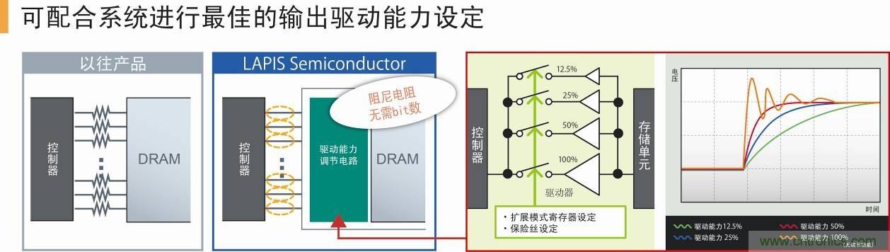 本功能有助于實現適合用戶系統的電流驅動能力優化、降低輻射噪聲、減少輻射噪聲對策零部件數量。另外,可按出貨時固定規格的驅動能力設定供貨,即使使用已有的SDRAM控制器無需配置擴展模式寄存器,即可使用最佳的輸出驅動能力設定的產品。