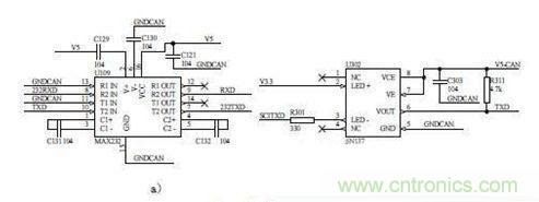 MAX232 是+5V電源的收發器,與計算機串口連接,實現RS-232接口信號和TTL 信號的電平轉換,使BMS 和PC 機能夠進行異步串行通訊。為了防止電磁干擾影響串口上數據的傳輸,必須對總線信號進行隔離。串口是單向傳輸,所以利用6N137光電耦合較為方便,圖 3b)所示為232TXD 信號光耦隔離電路。
