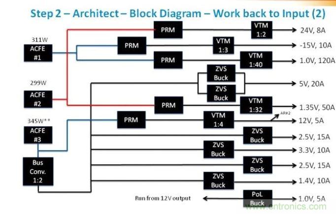 構(gòu)建系統(tǒng)的第一個(gè)步驟是創(chuàng)建一個(gè)電源系統(tǒng)的方框圖,從輸出開始,然后向輸入后向推進(jìn)。從最低功率級(jí)別開始它的運(yùn)作更好,并從那里繼續(xù)工作,以便可以審查功率元件類別,并隨功率級(jí)別的增加在必要時(shí)做出改變。