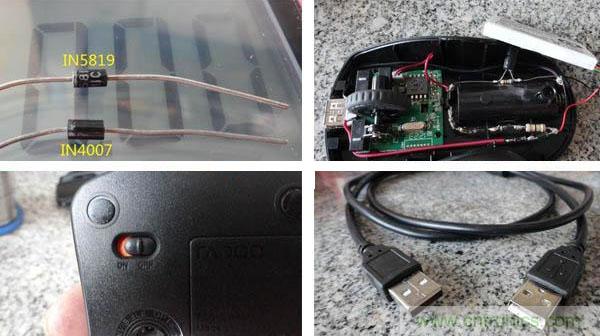 新加的鋰電正極通過15歐限流電阻和三個IN4007降壓,接到原電池正極,給鼠標供電。