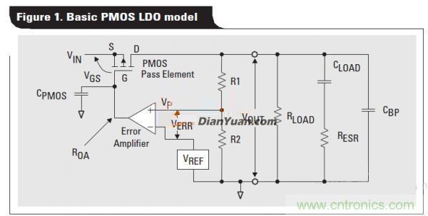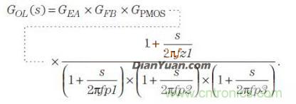 線(xiàn)性電源的等效模型模型如圖1所示, 穩(wěn)定直接如圖可知,電路的三個(gè)極點(diǎn)和一個(gè)零點(diǎn),即得到開(kāi)環(huán)傳遞函數(shù)Gop,GEA是誤差放大器的增益,GFB是反饋環(huán)路的增益,GPMOG是PMOS的增益。