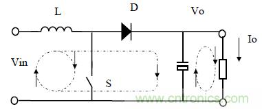 在這階段,電流波形是一條斜率為負的斜線,斜率為-Vout/Lo。當開關再次導通時,二極管迅速關斷,電流從輸入電源和開關管流過。在開關導通前瞬間,電感上的電流Imin就是開關管通過的初始電流。