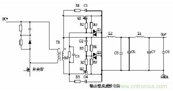 T1為開關變壓器,其初極和次極的相位相反。D1為整流二極管,R1、C1為削尖峰電路。L1為續(xù)流電感,R2為假負載,C4、L2、C5組成π型濾波器。