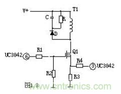 R4、C3、R5、R6、C4、D1、D2組成緩沖器,和開關MOS管并接,使開關管電壓應力減少,EMI減少,不發(fā)生二次擊穿。在開關管Q1關斷時,變壓器的原邊線圈易產生尖峰電壓和尖峰電流,這些元件組合一起,能很好地吸收尖峰電壓和電流。從R3測得的電流峰值信號參與當前工作周波的占空比控制,因此是當前工作周波的電流限制。當R5上的電壓達到1V時,UC3842停止工作,開關管Q1立即關斷。