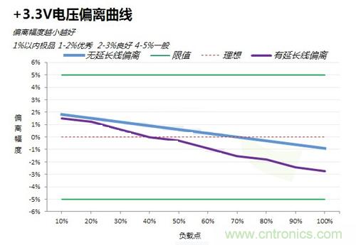 然后看下電源電壓偏離對比,可以發(fā)現(xiàn)在加入了延長線之后,電源的電壓也有一定程度的影響。其中+12V影響較大,+5V和+3.3V影響較小。