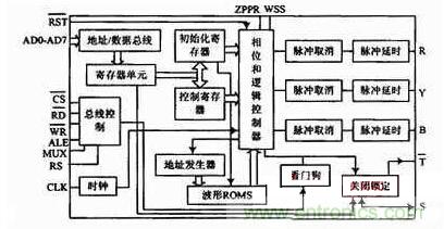 SA4828原理框圖如圖3所示。它接收并存儲微處理器初始化命令和控制命令,主要由總線控制、地址/數據總線、存儲器、控制寄存器組成,以控制字的形式實現。三相輸出控制電路的每相輸出控制電路由脈沖取消和脈沖延時電路構成,脈沖取消將脈沖寬度小于取消時間的脈沖去掉,延時電路保證死區間隔,以防止在轉換瞬間橋路開關器件出現直通現象。
