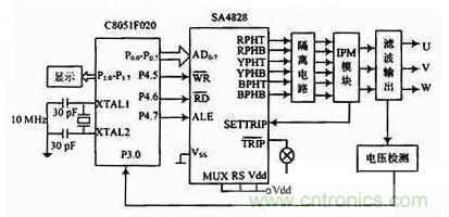 以SA4828與單片機C8051F020為核心構成的控制器電路設計如圖4所示??刂齐娐犯鶕o定的參數輸出三相SPWM信號給智能功率模塊IP-M,實現對功率晶體管的通斷控制。C8051F020通過8位P0端口與SA4828的地址、數據管腳AD0~AD7相連,工作時,單片機首先對SA4828進行初始化,定義載波頻率,電源頻率范圍、死區、最小脈沖取消時間等參數。然后向SA4828的控制寄存器傳送電源的頻率控制字和幅度控制字等參數。正常工作時,根據需要對SA4828的控制數據進行修改,實現系統的反饋與實時控制,以及調壓控制。為實現系統的穩壓功能,采用平均值反饋PI調節。輸出電壓經隔離送入C8051F020單片機的A/D轉換口即P3.0口,轉換結果參與PI運算,運算結果即為SA4828幅度控制寄存器的控制字。從RPHT~BPHB的6個引腳輸出相應頻率和電壓的SPWM控制信號,經隔離電路后,分別控制智能功率模塊IPM的6個IGBT的導通與截止,最后在3個輸出端上產生對稱的三相SPWM電壓。SA4828作為單片機的外設,與單片機并聯,通過對單片機編程,只需將SPWM的初始化信息和控制信息寫入SA4828的相關寄存器,即產生精確的全數字化的三相的SPWM波形。