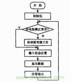 單片機在初始化程序中完成對單片機、SA4828以及其他可編程器件的初始化,接著對市電進行檢測,如果市電不正常,則啟動逆變器工作,通過控制將開關元件切換至逆變器輸出。并將輸入狀態存入控制寄存器,顯示數據,如果輸出電壓或保護等發生改變,則報警輸出以采取措施使系統正常運行。