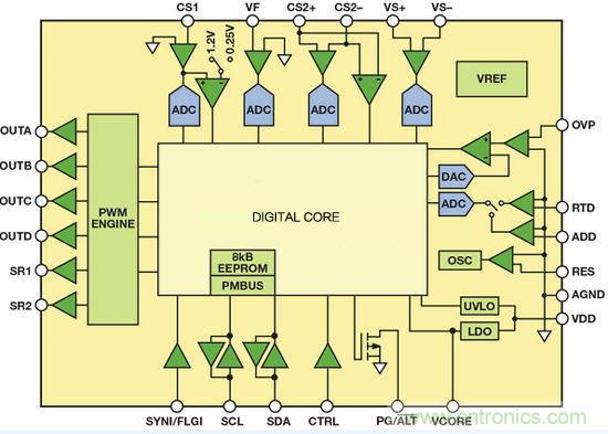 該器件非常適合高密度DC-DC電源轉(zhuǎn)換,具有6個(gè)可編程脈沖寬度調(diào)制(PWM)輸出,可控制大部分高效電源拓?fù)洹A硗猓撈骷€能控制同步整流(SR),并集成6個(gè)模數(shù)轉(zhuǎn)換器(ADC),能夠采樣模擬輸入電壓、輸入電流、輸出電壓、輸出電流、溫度以及其它參數(shù)。轉(zhuǎn)換為數(shù)據(jù)后,將這些信號(hào)發(fā)送至數(shù)字內(nèi)核模塊進(jìn)行處理。該器件采用靈活的狀態(tài)機(jī)架構(gòu),以硬件實(shí)現(xiàn)全部功能,提供穩(wěn)定可靠的解決方案,但無法通過編程實(shí)現(xiàn)設(shè)計(jì)以外的功能。器件的全部功能--包括輸出電壓調(diào)整--均以數(shù)字方式處理。為了調(diào)整輸出電壓,應(yīng)通過PMBus接口發(fā)送一條命令,改變數(shù)字基準(zhǔn)電壓值。