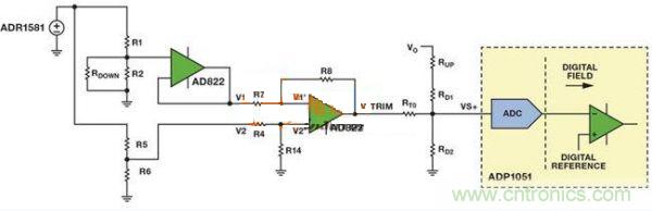 圖5中的電路具有兼容模擬向上或者向下調(diào)壓的功能兩個(gè)電阻分壓器產(chǎn)生兩個(gè)基準(zhǔn)電壓,其中一個(gè)基準(zhǔn)電壓表示模擬控制器所需的輸出基準(zhǔn)電壓,另一個(gè)表示內(nèi)部基準(zhǔn)電壓。利用一個(gè)電壓跟隨器來避免所需的輸出基準(zhǔn)電壓與后續(xù)電路相互影響。利用AD822 FET輸入運(yùn)算放大器,將所需的輸出基準(zhǔn)電壓(V1)從模擬控制器的內(nèi)部基準(zhǔn)電壓(V2)中去除,得到所需的電壓差。此電路的線性放大增益確保了VTRIM足夠大,從而能對(duì)VVS+產(chǎn)生影響。